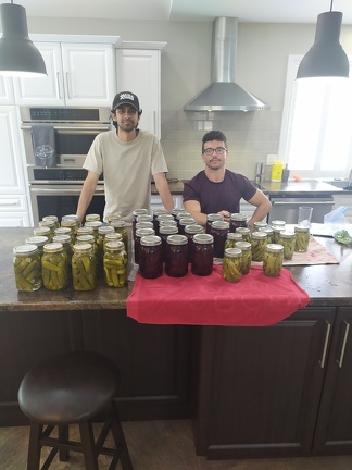 Canning with Frank and Mukund. My famous dill pickles with dill I grow at home. Beet pickles, with beets I also grow at home, and spicy pickled beans from the garden as well.