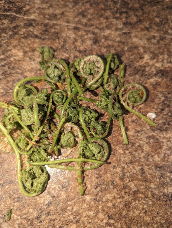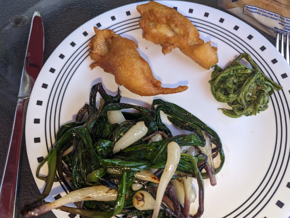 Every spring the first plants up are fiddleheads and wild ramps. I take students out to harvest, then back to my place to cook and eat them. I'll provide some fish or wild game to make the meal complete. Very satisfying!