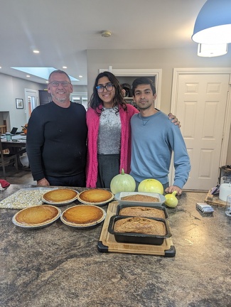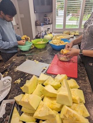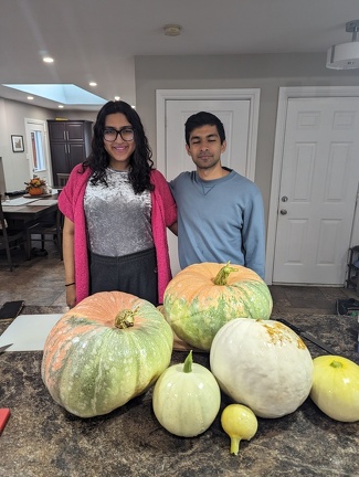 In any event, I ended up with enough pumpkins to give away ornamental pumpkins to all my family and I had all the kids in the neighbourhood come by and pick a pumpkin for Halloween. And then I had some students over to process the pumpkins. We carved them up, baked them, processed them, then turned them into pumpkin pies and pumpkin spice loaf - delicious!